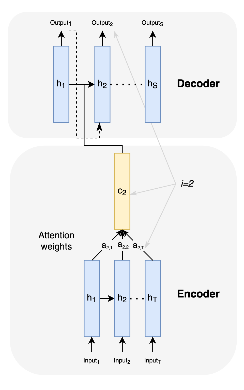 The architecture extended by attention transmits context-dependent states \(c_{i}\) to the decoder instead of \(c\) for each input: \begin{equation} c_{i} = \sum_{t=1}^{T}a_{it}h^{t} \end{equation} The weight \(a_{it}\) for each state \(h^{t}\) (also called ‘annotation’ in (Bahdanau et al. 2014)) is determined as follows: \begin{equation} a_{it} = \frac{\exp(e_{it})}{\sum_{k=1}^{T}\exp(e_{ik})} \end{equation} where \(a_{it}\) is a normalization (softmax function) for the model \(e_{it}\). This model is again a feedforward network with a single layer that evaluates how well the input at time \(t\) matches the output at position \(i\). Thus, overall, each input \(x^{1}...x^{T}\) receives its own set of attention weights, resulting in \(c_{i}\), a context vector that helps the decoder determine the appropriate output (e.g. ‘l’homme’) for each input.