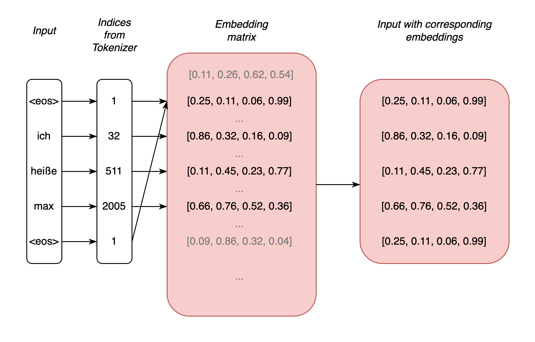 For processing the input, the Transformer architecture provides an embedding matrix for all vocabulary of the data that is used in the training of a Transformer model. The size of the matrix corresponds to the number of vocabulary words (otherwise referred to as tokens, which also include punctuation marks, for example) with a selected dimension (i.e. n x d), with which each input token can be assigned exactly one row within the matrix (cf. Fig. 6). The number of columns corresponds to the selected dimension. The matrix values for the token types are randomly selected during the initialization of a Transformer model. It is the rows of this matrix that are also referred to as embeddings. It can also be said that each token type has a vector representation. In a further step, these vectors are added to the positional encoding to give the input a unique representation. It is crucial that the embeddings of the Transformer architecture also change in the course of training, i.e. they can be adapted according to the data, i.e. ‘learned’. (Note 1: the first step is to convert the input tokens into an index representation based on a tokenizer, with which each token can be assigned a row in the embedding matrix; note 2 – and this took me some time to understand: BERT embeddings and the like are not those embeddings from the input; these embeddings are rather the result of the attention mechanisms and extracted from the end of a Transformer layer).