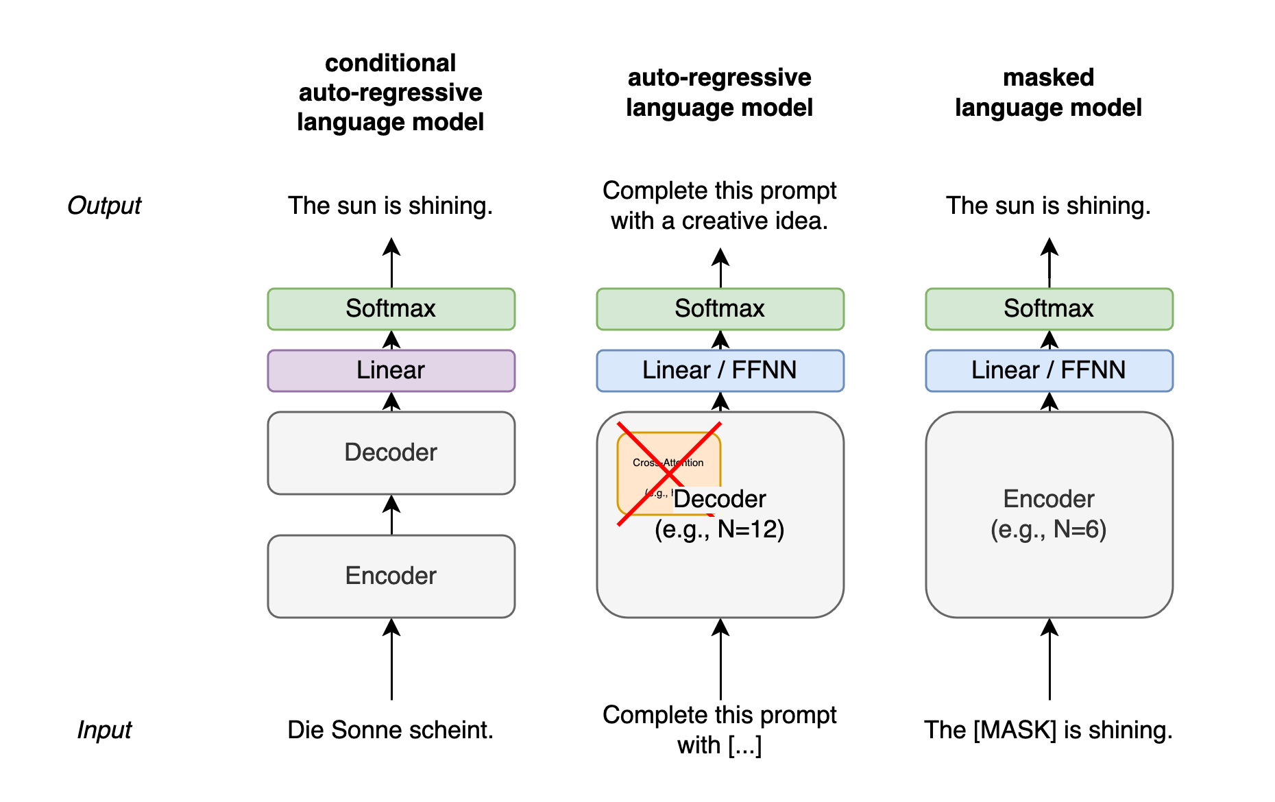 Fig. 11: Different Transformer architectures: encoder-decoders for machine translation (also called MTM), single decoders for sequence generation (also called LM), and single encoders for downstream tasks (also often called MLM)