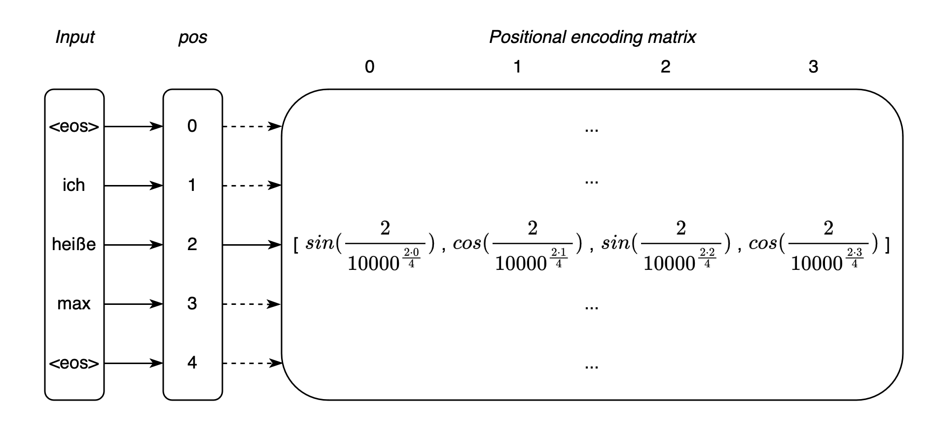 To illustrate positional encoding, it is helpful to first consider a very simplified example. Assume that each embedding is simply assigned the positions (pos) of the respective token in the form of integers with \(n \in N\), where \(N\) corresponds to the length of the input tokens including <eos> tokens. If we select the token “heiße” and its embedding [0.11, 0.45, 0.23, 0.77] (imaginary values), then a positional encoding of [2, 2, 2, 2] could be determined for the token within the sequence “<eos> ich heiße max <eos>” as follows. The vector of the token would have these values because we chose the second position of the sequence (sequence starts at 0) and an embedding dimension of \(d=4\). According to the Transformer architecture, we could then add this vector to the embedding of the token [2.11, 2.45, 2.23, 2.77] and thus add additional information to it. However, this approach would lead to several problems; for example: large position values for long sequences would override the values of the embeddings and a relative reference of recurring positional patterns would be missing.