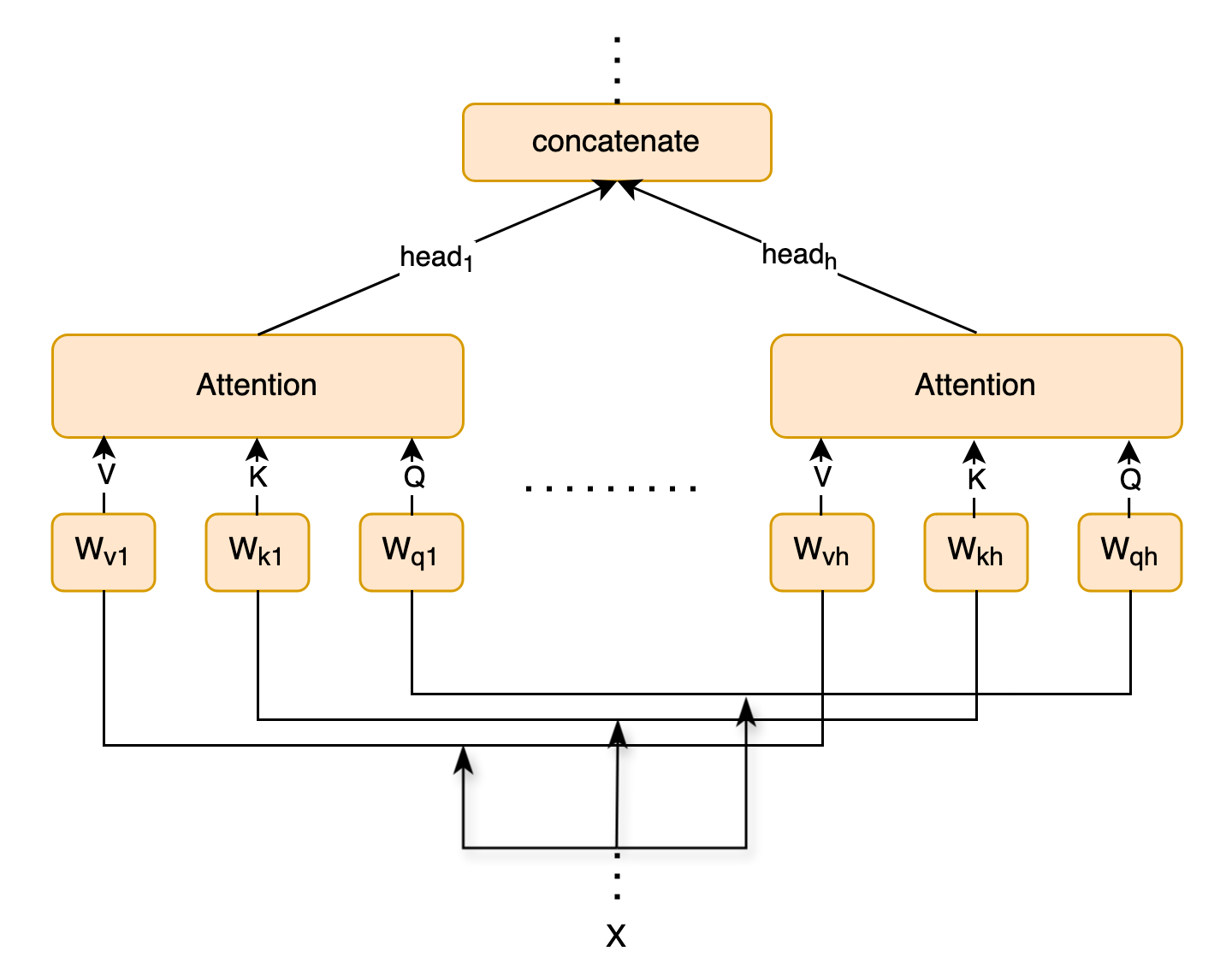 Attention can be calculated \(h\) times in parallel, where \(h\) corresponds to a selected number of heads (also called attention heads). Vaswani et al. (2017) choose \(h=8\) heads, whose values are concatenated and finally passed on to the layer normalization in the coders (see Fig. 9 and Fig. 5). The use of multiple heads is referred to as ‘multi-head attention’.