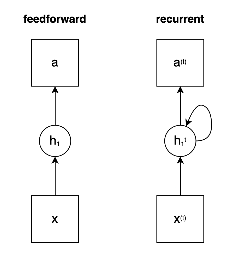 Fig. 2: Status of a neural network without (feedforward) and with feedback (recurrent) and in each case an input layer \(x\), a hidden layer \(h_1\) and an output \(a\)