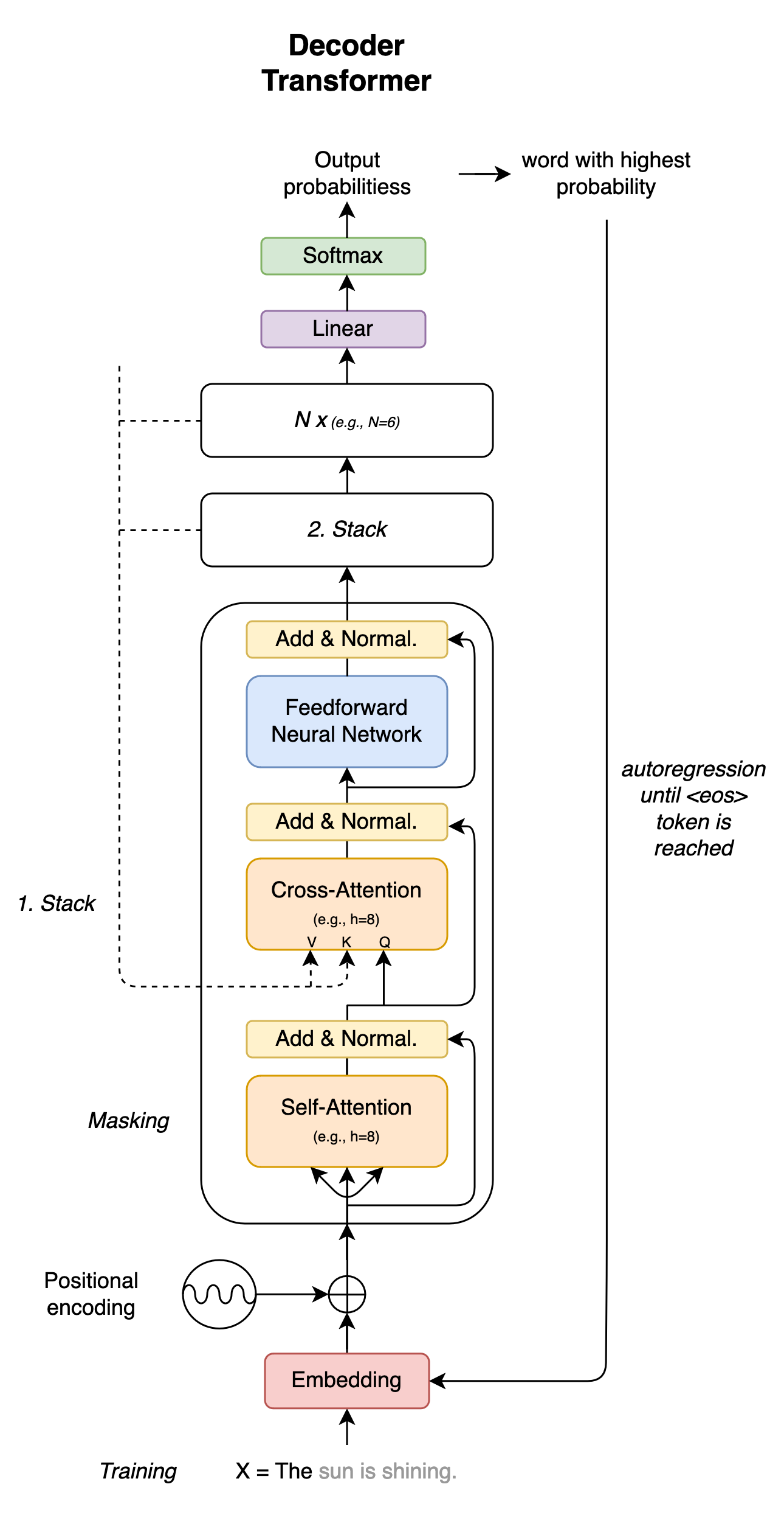 The self-attention layer of the decoder allows parts of the decoder input to be masked (this is also described as masking, or more precisely causal masking). A Transformer encoder, on the other hand, allows all inputs to be viewed simultaneously. Masking plays an important role in the goal of the decoder: e.g. the prediction of a translation. To predict a translation sequence, the decoder works autoregressively from token to token (e.g. from left to right, see also (7)). This means that during inferencing, each prediction only works with the help of previous tokens, the others remain masked in a figurative sense. For training, correct translations can be added to the model as input by Professor Forcing in order to minimize error propagation – as with the sequence-to-sequence models described above. Basically, the training goal is to optimize the predictions of the model based on the translation solutions. A translation process terminates in any case when the token <eos> or the previously defined maximum sequence length is reached.