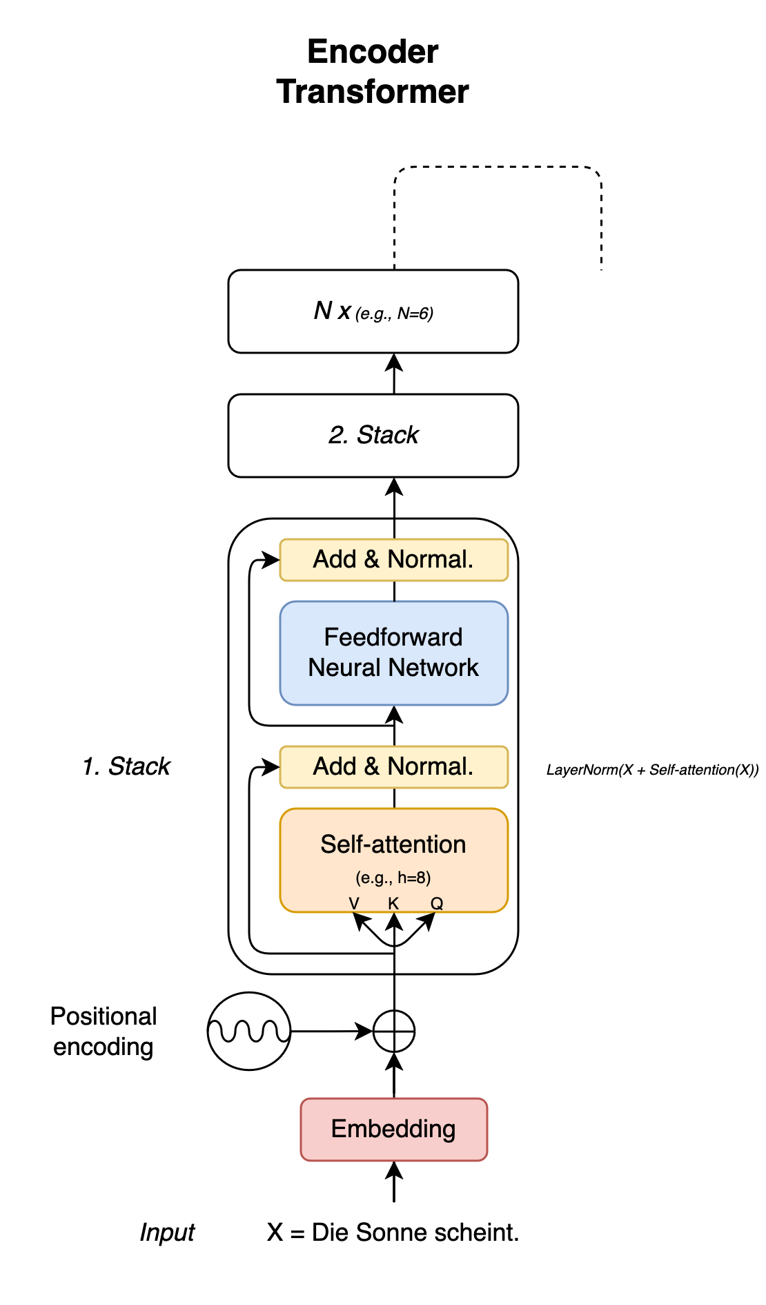 As with the previous sequence-to-sequence architectures, the input is first converted into embeddings. However, the embeddings are additionally provided with positional encoding, which is realized via a frequency representation (sine and cosine functions). The reason for this is as follows. In contrast to the recurrent approaches, the attention layer of a Transformer encoder processes an input sequence all at once and not word by word in the case of a translation, for example. Without additional information on the position of each input within a sequence, the coders would lack the important information on how the individual words follow each other.