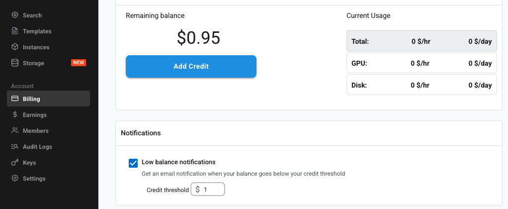 After having created an account on vast.ai, charge your credit with 5€-10€.