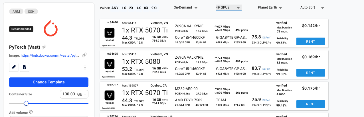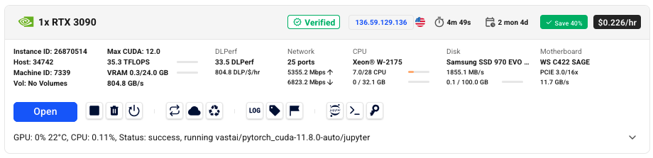 - Check that the instance’s resources (CPUs, RAM) aren’t already heavily used. Some servers share hardware, and it’s possible to find instances on vast.ai where CPU cores are busy.