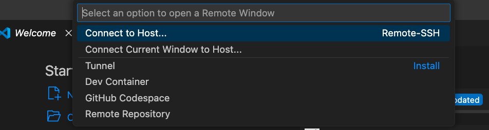 Next, we can open VS Code and try to connect to the remote host. The name from the config should appear as an option, when we click Connect to Host...